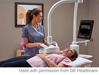 Oftentimes, mammography gets false negatives when scanning dense breast tissue. Because dense breast tissue appears white on a mammogram, it cloaks posssible tumors behind it- deeming the mammogran unreliable. The two forms of breast density is either FIBROCYSTIC or GLANDULAR tissue. Through ultrasound, we can check for tumors easily through fibrotic dense breasts because it stands out as a black region (or a black hole) within the white area. As shown in Image 3, a black hole could get lost, making it more difficult to image this type of dense breast. In this case, a solution is the use of elastography, which offers visual confirmation as indicated by color data. Elastography can measure tissue density (its hardness or elasticity) within the glandular breast tissue. . [see complete report)